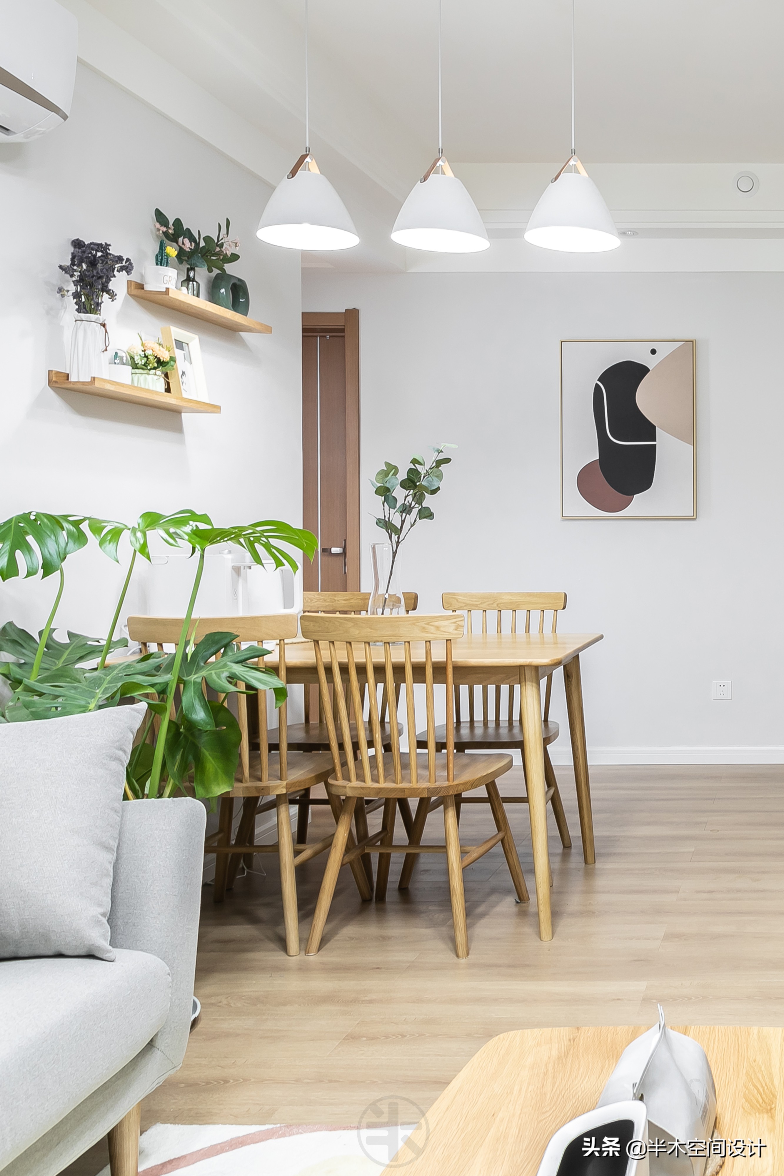 通过与屋主的沟通了解,屋主小姐姐在整体风格的喜好上偏向北欧、日式、轻奢复古,材质上喜欢温馨的木质感。基于此,我们使用了暖灰色墙面搭配原木材质的家具,希望通过木纹与绿植的简单搭配,营造出自然、闲适的放松感觉。同时通过抽象装饰画给到家中一些复古、时尚的元素点缀。