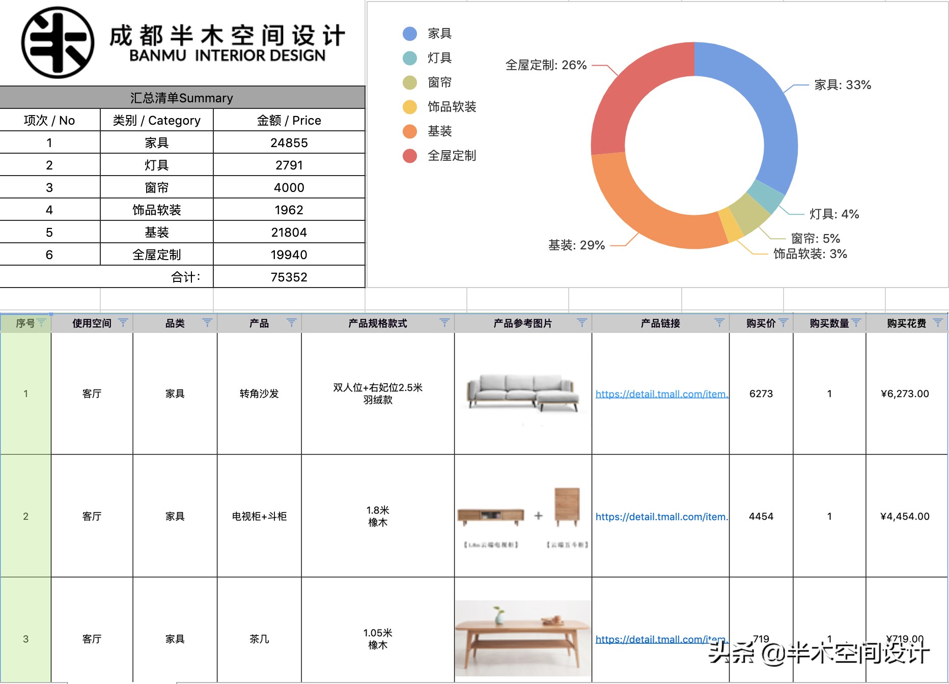 ▲预算清单分享,前期调研时屋主就表示预算需要帮她好好控制一下,最好不要超过8W,目标也是圆满达成。如果对完整的清单内容感兴趣,欢迎留言私信。