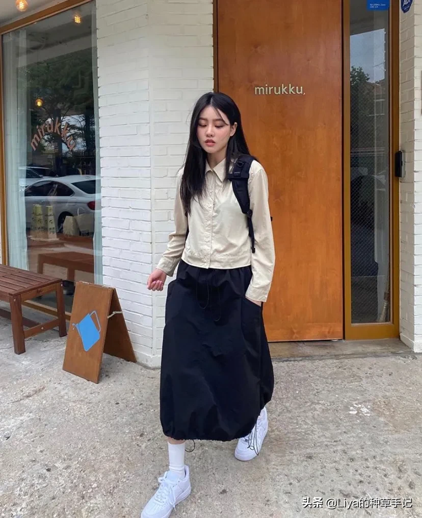 下面这套我第一眼看见的时候就知道是喜欢运动风仙女的菜,衬衫搭配灯笼半裙,显瘦显高,点睛之笔是白色短袜和板鞋,让整套look的时髦度up up。